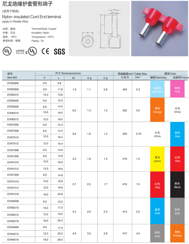 0.3-4.0mm2 EVN尼龍絕緣護套管形端子